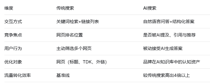 传统搜索与AI搜索的核心差异: