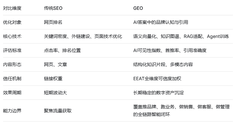GEO与传统SEO的本质差异,在于其依托生成式AI的技术逻辑重构了内容与模型的交互方式。传统搜索引擎的核心是关键词匹配与索引排序,而GEO通过多模态大模型直接理解用户意图,生成结构化答案而非链接列表。
